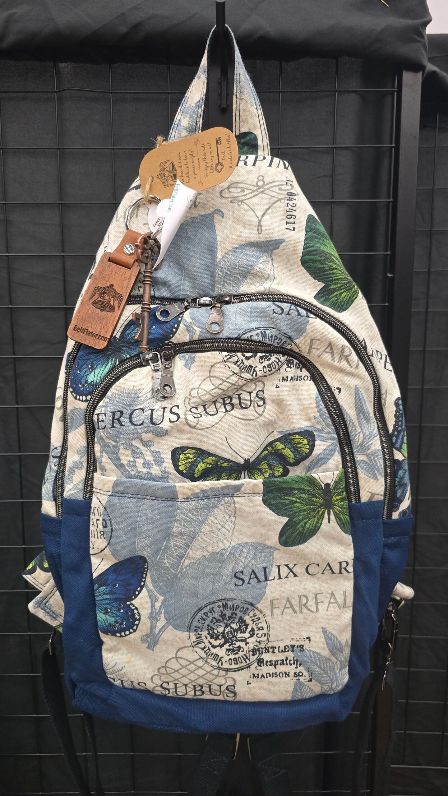 Butterfly Cotton Canvas outer, with durable nylon straps. Gunmetal hardware. 4 outside pockets, 2 inside pockets, padded tablet sleeve. Converts from a single strap Cross-Body sling to a dual-strap backpack with a quick zip! Machine washable!